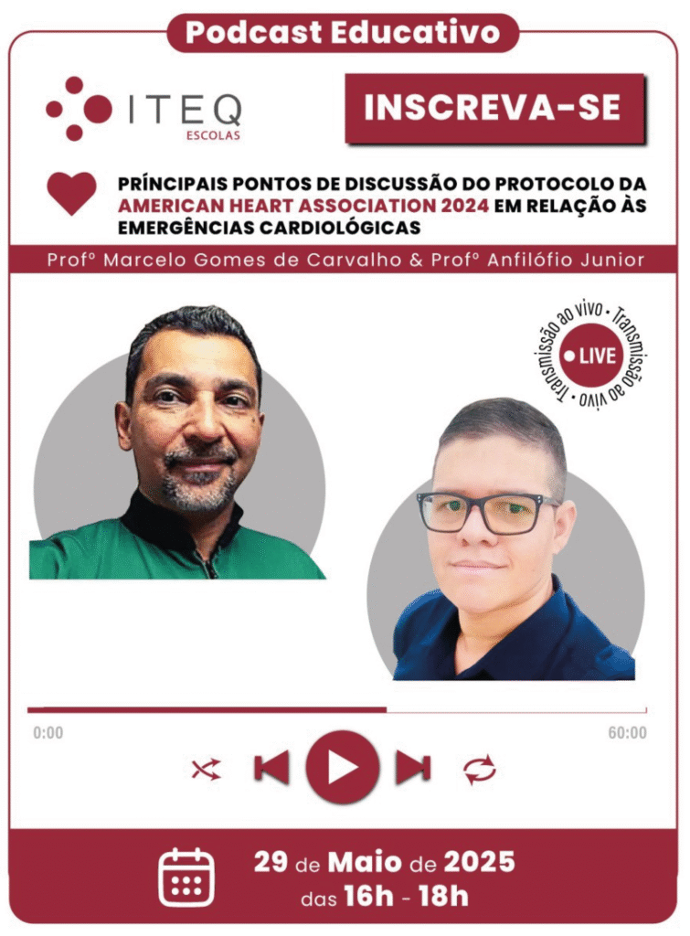Nesse mês, o ITEQ preparou uma oportunidade imperdível para você, profissional da saúde que busca aprimoramento e crescimento na carreira. Convidamos você a participar de nossas lives exclusivas com especialistas de renome, como Marcelo Gomes de Carvalho, enfermeiro com vasta experiência em emergências e transporte aeromédico, e Anfilófio Junior, atuante em terapia intensiva e resgate. Nessas sessões ao vivo, serão discutidos temas atuais e práticos, incluindo as recentes e cruciais atualizações dos protocolos da American Heart Association (AHA) 2024 para o manejo de emergências cardiológicas. Você terá a chance de se aprofundar em tópicos como a otimização da RCP com compressões torácicas e ventilação eficazes, o momento ideal para a administração de epinefrina e antiarrítmicos, a utilização da capnografia como ferramenta essencial de monitoramento, as mudanças na cadeia de sobrevivência para melhorar a resposta em paradas cardíacas, e as estratégias de cuidados pós-parada para otimizar a recuperação dos pacientes.